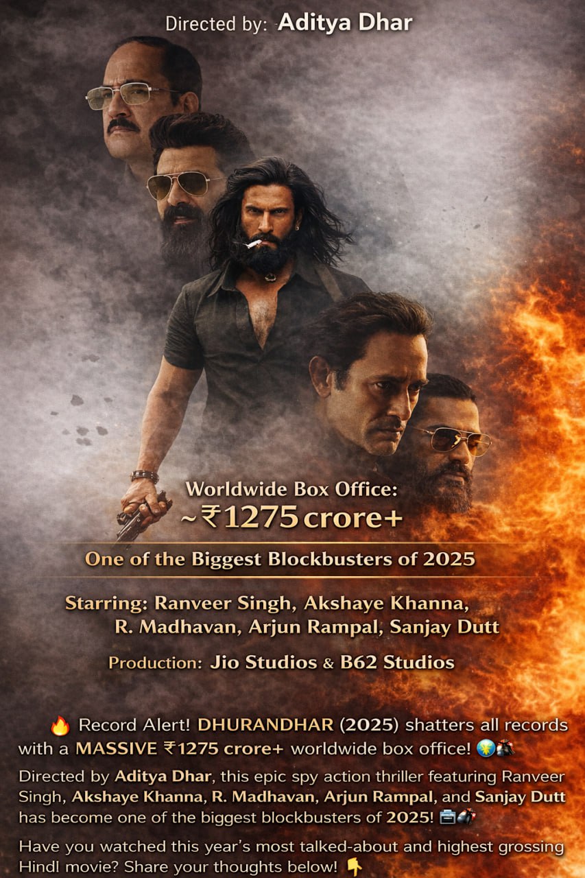 Mass action, strong performances & full paisa-vasool vibe, Dhurandhar is one of the biggest Bollywood blockbusters of 2025.  Directed by Aditya Dhar  Ranveer Singh, Akshaye Khanna, R. Madhavan, Arjun Rampal, Sanjay Dutt, Worldwide Box Office: